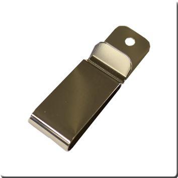 Gürtelclips aus vernickeltem Federstahl mit zusätzlichem Loch zum Vernieten. Ideal zu Realisierung einer schnellen und flexiblen Befestigung von Scheiden oder Etuis. Die Bohrung ist bei allen Varianten Ø3 mm.