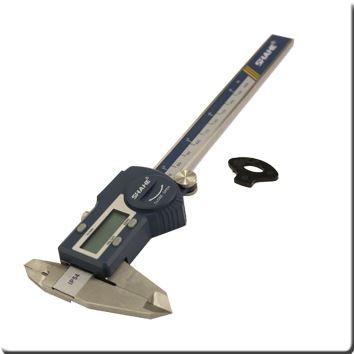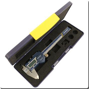 Hier finden Sie einen Messchieber mit digitaler Anzeige der Messwerte. Dieses Messinstrument hat einen Messbereich vom 0-150mm; die Anzeige ist auf zwei Kommastellen genau. Um im rauen Werkstattbetrieb eingesetzt zu werden, ist es staub- und wasserdicht ausgeführt. (IP54)