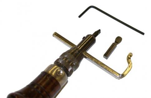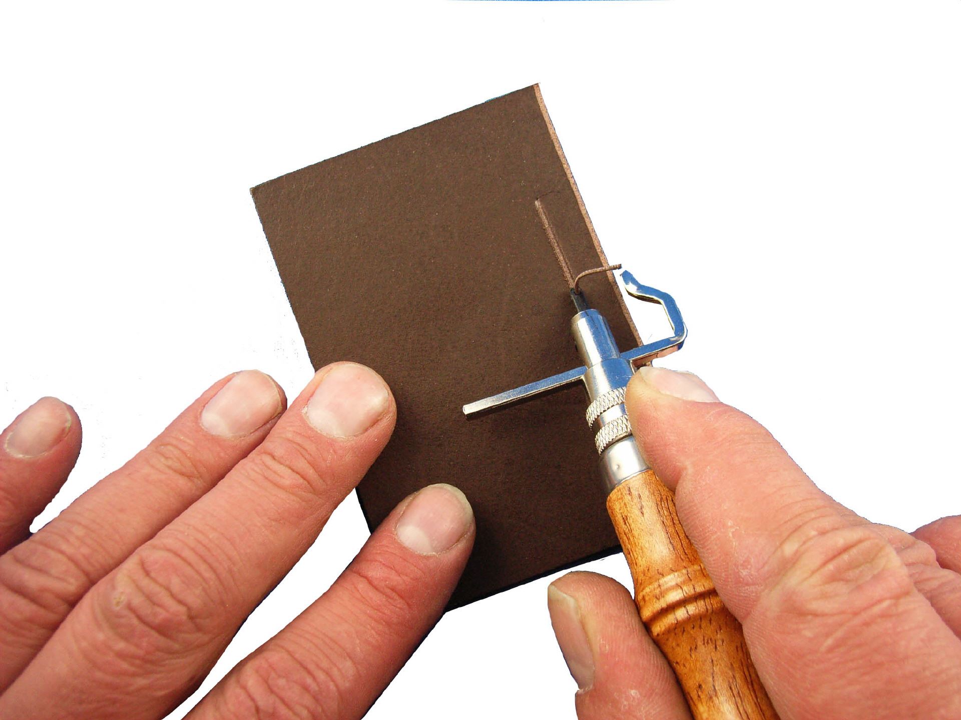 Der Anschlag lässt sich sowohl links als auch rechts montieren oder, zum Arbeiten frei Hand, ganz entfernen. Als weitere Feature kann die Schneide durch einen kleinen Spatel ersetzt werden. Somit lassen sich auch dekorative Linien an der Lederarbeit, Ähnlich eines Reiffeleisen oder -holz, anbringen, ohne eine Kerbe zu schneiden.
