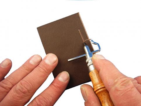 Mit dem Nahtversenker wird eine halbrunde Kerbe entlang der Linie der späteren Naht geschnitten. In dieser Kerbe werden dann wie üblich die Lederteile vernäht. So wird die Naht unter das Niveau des Leders "versenkt" und kann sich bei der Benutzung nicht mehr aufscheuern.