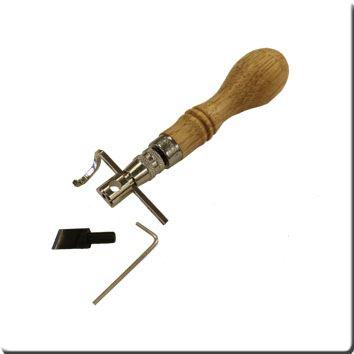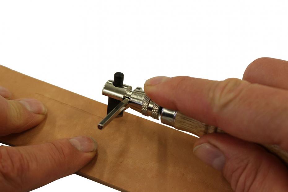 Dieser Parallelschneider wird, wie ein Reiffeleisen►zum Ziehen von Linien, parallel zur Lederkante, verwendet. Im Gegensatz zum Reiffeleisen erzeugt der Parallelschneider allerdings einen Schnitt. Die Breite des Randes kann mit dem verstellbaren Anschlag eingestellt werden. Wenn z.B. beim Punzieren der Hintergrund abgetieft werden soll, kann man so einen gleichmäßigen Rand erzeugen. Das Werkzeug verwendet die gleiche Klinge wie unser Punziermesser ►.Geliefert wird der Halter mit schräger Punziermesserklinge. Ein Schlüssel zum Verstellen des Anschlags wird ebenfalls mitgeliefert.