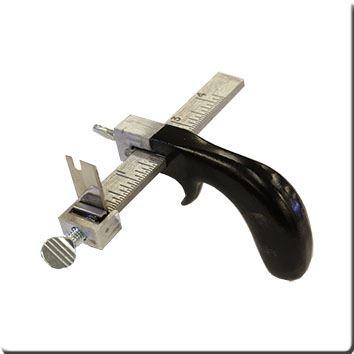 Mit diesem Riemenschneider können Riemen in verschiedenen Breiten aus Leder geschnitten werden. Das Werkzeug ist komplett aus Metall gefertigt; der Griff mit Kunststoff ummantelt. Die Breite wird durch Verschieben des Messerhalters eingestellt. Die Klinge ist in einer Zwinge geklemmt und austauschbar.