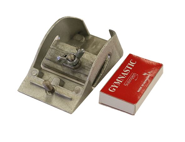 Dieser kleine Hobel ermöglicht es mit seiner feinen Klinge, Leder im geraden Schnitt auszudünnen (= ausschärfen). Der Körper ist im Spritzgussverfahren aus Aluminium gefertigt, die Klingen aus gehärtetem Stahl. Die Klinge kann an zwei Positionen befestigt werden.