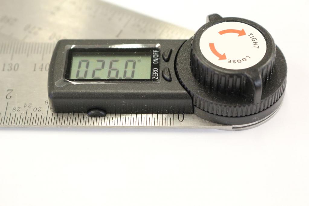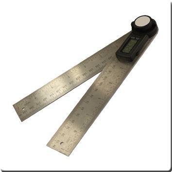 Diesen digitalen Winkelmesser haben wir als Ersatz für unseren (nicht mehr lieferbaren) mechanischen in unser Programm aufgenommen. Ursprünglich als Einstellhilfe für unsere Maschinen gedacht, lässt er sich natürlich auch in vielfältiger Weise für viele Anreiß-, Mess- und Prüfaufgaben einsetzen. Die beiden Schenkel aus rostfreiem Stahl sind sowohl Millimeter- als auch Zoll-Skala versehen. Mit einem Drehknauf kann der Winkelmesser auf dem gesamten Messbereich geklemmt werden.