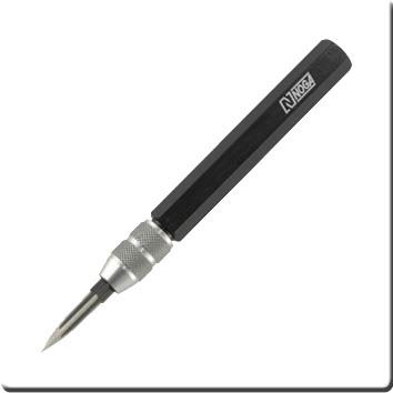 Dieser Schaber besteht aus einem achtkantigem, schwarz eloxierten Aluminiumschaft und einer austauschbaren, beidseitigen Dreikantklinge ►. Diese wird mittels einer Spannzange mit gerändelter Mutter befestigt. Das Werkzeug liegt gut in der Hand und erlaubt so ein präzises Schaben und Entgraten kleiner Werkstücke und Bohrungen. Der kantige Schaft verhindert das Umherrollen auf der Werkbank.