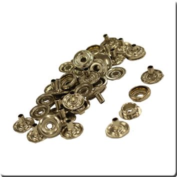 10er-Packung Druckknöpfe für Riemen- oder Taschenverschlüsse. Die Knöpfe sind vierteilig und werden durch Vernieten befestigt.