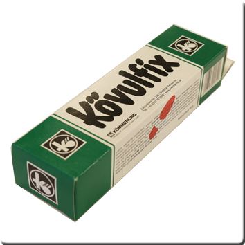 Kövulfix Rekord, ein Kontaktkleber aus der Schuhindustrie, für die Verklebung von Leder, Gummi, Polyurethan (PUR), Gummisohlen, Kunststoffplatten, Filz, Kork, Pappe, Schaumstoff, Metallfolien, Holz, Furniere und viele weitere Materialien.